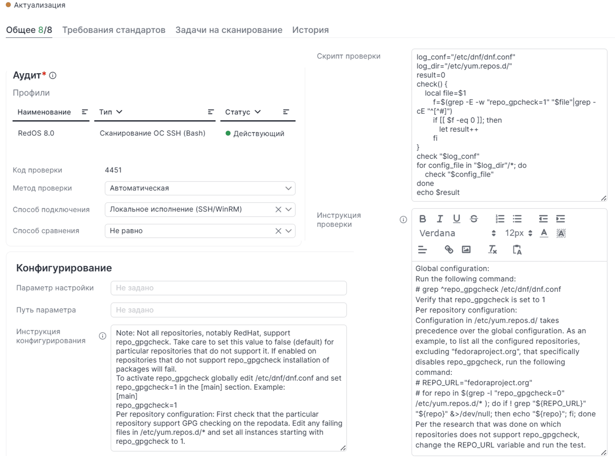 Отдельным преимуществом является возможность самостоятельно собрать не только «золотой образ», но и требования, проверки, скрипты проверок с выполняемыми командами. Таким образом, сильно расширяются возможности кастомизации и подстройки под используемые в компании стандарты.